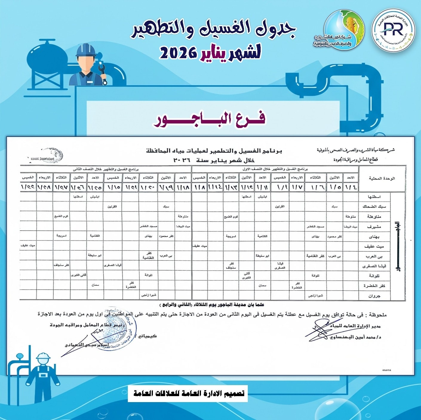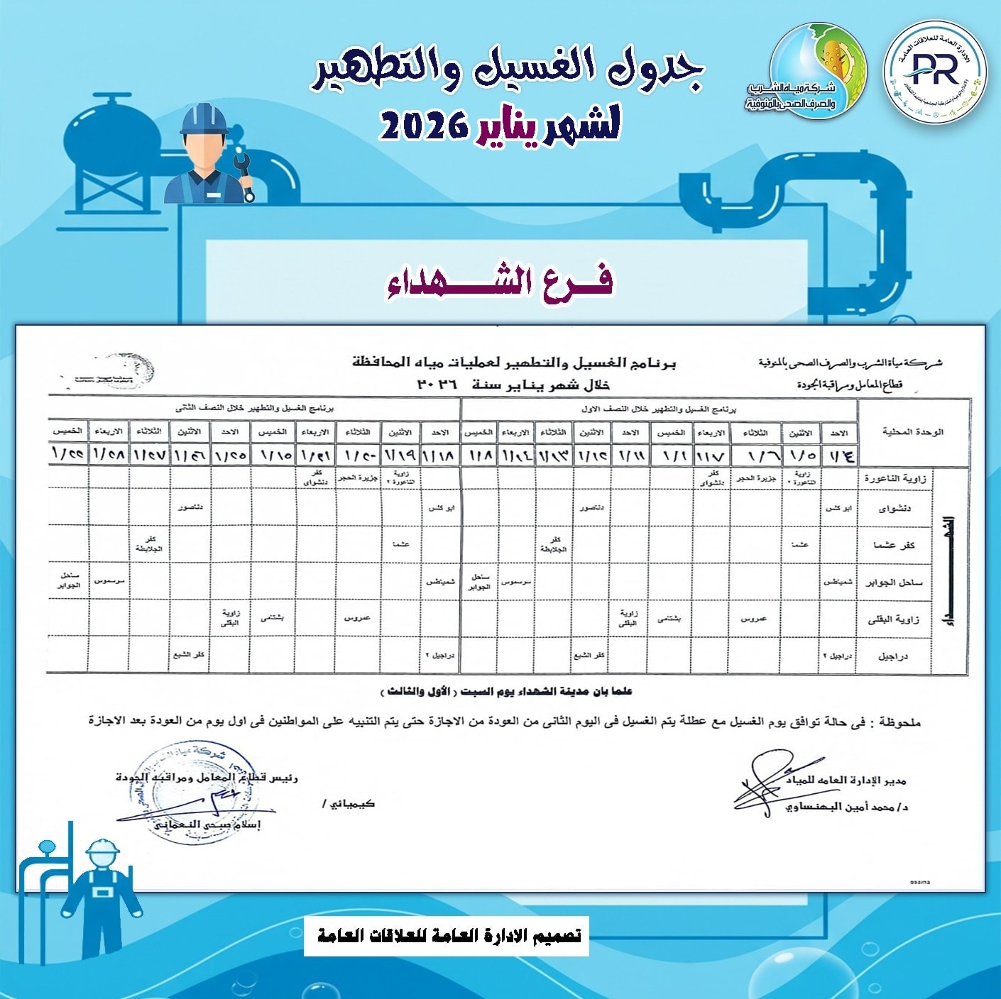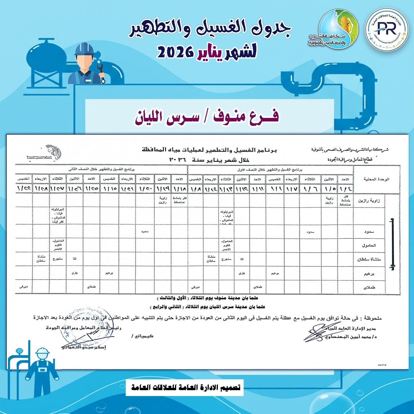 أعلن المهندس رشدي السيد عمر ، رئيس شركة مياه الشرب والصرف الصحى بالمنوفية، خطة غسيل شبكات المياه بكافة مناطق المحافظة خلال شهر يناير 2026م وفقًا للمناطق المحددة بجدول الغسيل الدورى للشبكات .