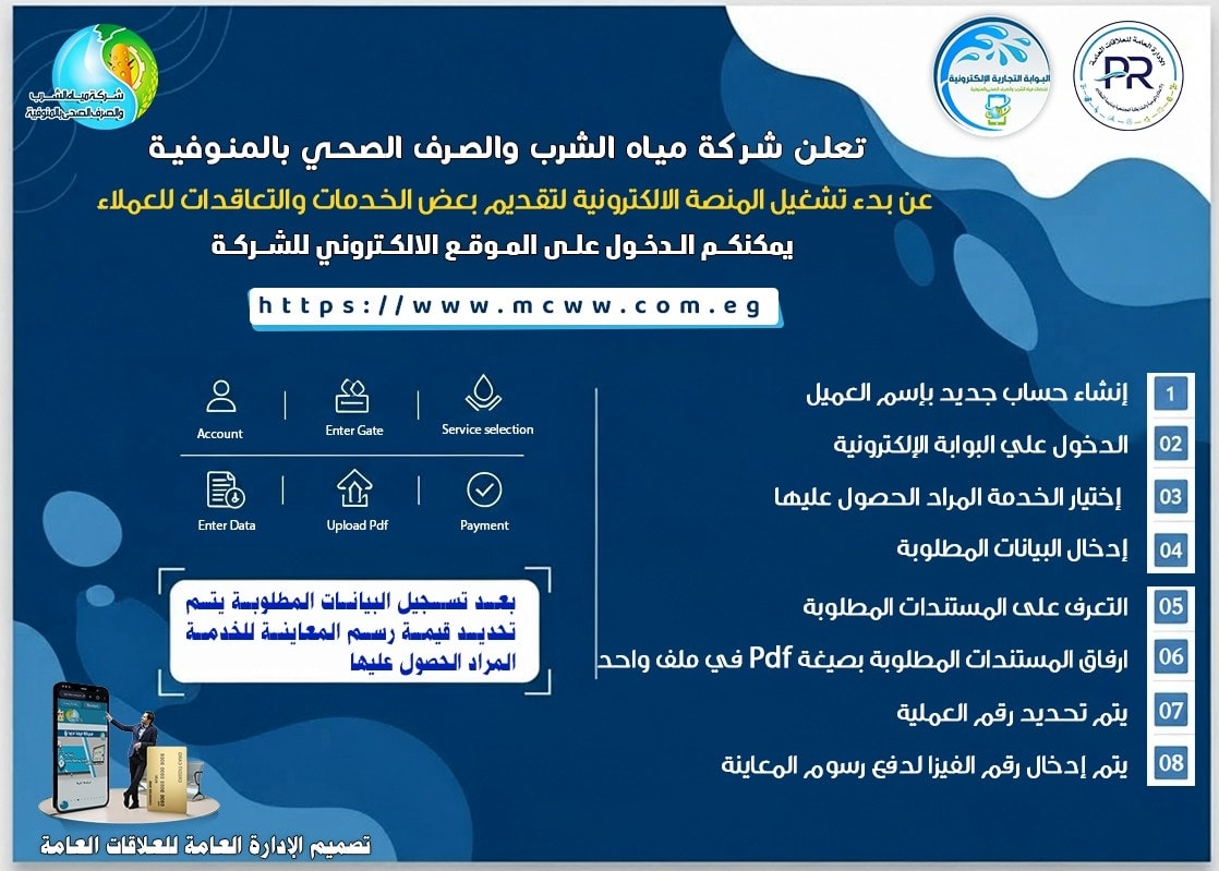 • تعلن شركه مياه الشرب والصرف الصحي بالمنوفية عن بدء تشغيل المنصة الالكترونية لتقديم بعض الخدمات والتعاقدات للعملاء . #طريقة_الدخول_علي_المنصة - يمكنكم الدخول على الموقع الالكتروني للشركة mcww.com.eg - إنشاء حساب جديد بإسم العميل - الدخول علي البوابة الإلكترونية - إختيار الخدمة المراد الحصول عليها - ادخال البيانات المطلوبة - التعرف على المستندات المطلوبة - ارفاق المستندات المطلوبة بصيغة Pdf في ملف واحد - يتم تحديد رقم العملية - يتم إدخال رقم الفيزا لدفع رسوم المعاينة #ملحوظة :- بعد تسجيل البيانات المطلوبة يتم تحديد قيمة رسم المعاينة للخدمة المراد الحصول عليها